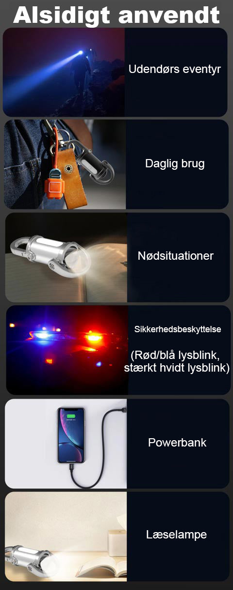 Dette er ikke bare en lommelygte, men et multifunktionelt værktøj til uforudsete situationer. Takket være den indbyggede powerbank kan du oplade din smartphone eller andre enheder, når du har mest brug for det. Den drives af et kraftigt 1000mAh batteri, hvilket gør den til et uundværligt redskab på rejser og eventyr.