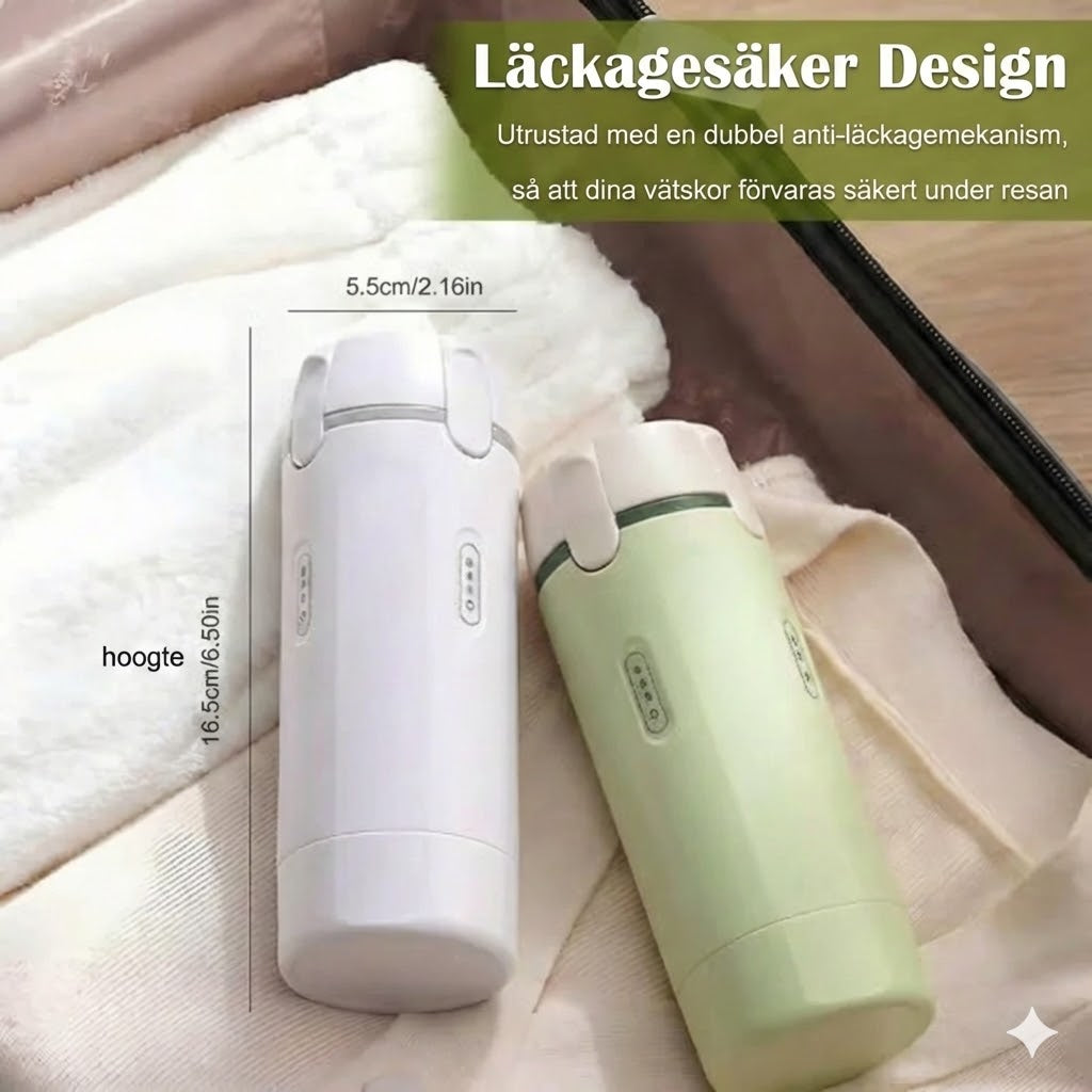 Slipp röriga necessärer fyllda med småflaskor. Den innovativa 4-i-1 reseflaskan samlar dina viktigaste hygienprodukter i en elegant cylindrisk behållare. Storleken motsvarar ungefär en smartphone och får enkelt plats i handväskan eller handbagaget. Perfekt för smidig passage genom flygplatsens säkerhetskontroll.