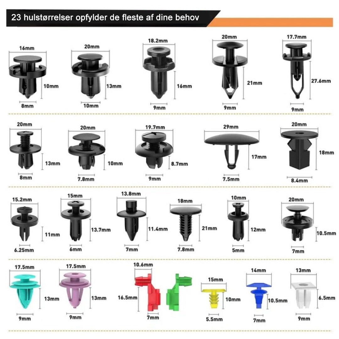 Sættet leveres med en professionel clip remover, så du kan fjerne gamle clips sikkert uden risiko for ridser eller skader. Drop skruetrækkere, der ødelægger lakken – med dette værktøj holder du din bil i topform, uanset om du arbejder på kofangere, dørpaneler eller andre karrosseridele.