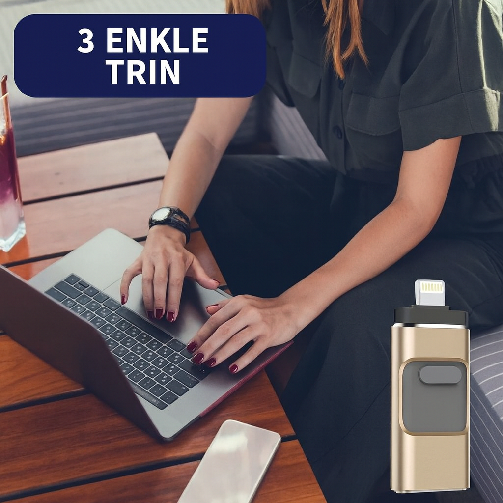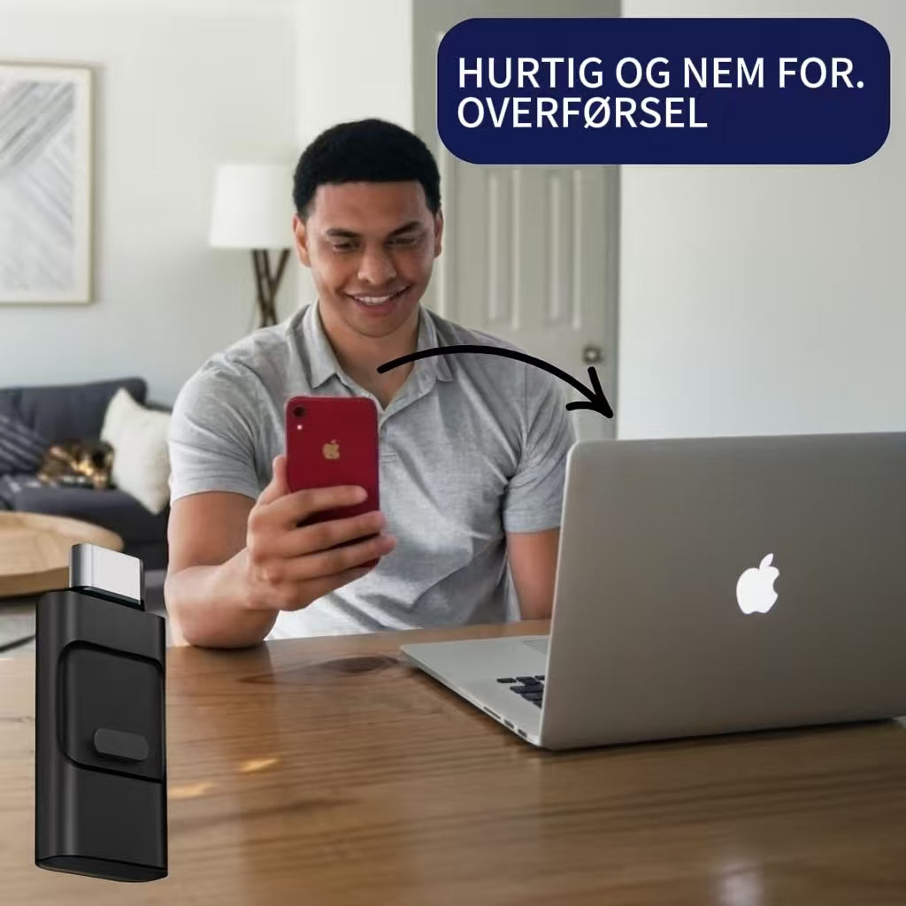 Den professionelle Flash Drive er din direkte løsning. Denne 4-i-1 USB-stick gør det enkelt at overføre billeder, videoer og dokumenter mellem smartphone, laptop og tablet – helt uden kabler og apps. Plug & Play-komfort, hvor end du er.
