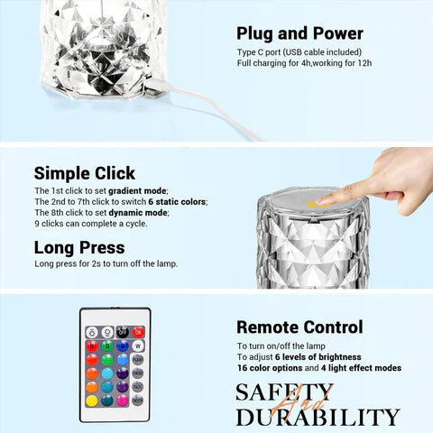 Bring en stemning af moderne luksus ind i dit hjem med denne unikke diamant-design lampe. Den skinner med et særligt 3D-lyseffekt, der projicerer et smukt rosenmønster på dit bord eller skrivebord. Det krystalklare, diamant-slebne overflade skaber øjeblikkeligt en romantisk atmosfære og giver ethvert rum et eksklusivt præg.
