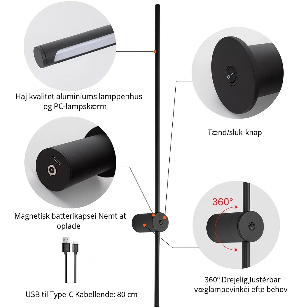 Her forenes funktionalitet og æstetik i ét smart design. Den 360° drejelige arm gør det nemt at rette lyset præcist dér, hvor du har brug for det – perfekt til en læsekrog eller til at fremhæve et objekt. Det slanke aluminiumsdesign tilfører en moderne og elegant detalje, der passer til enhver indretningsstil, hvor stil og funktionalitet går hånd i hånd.