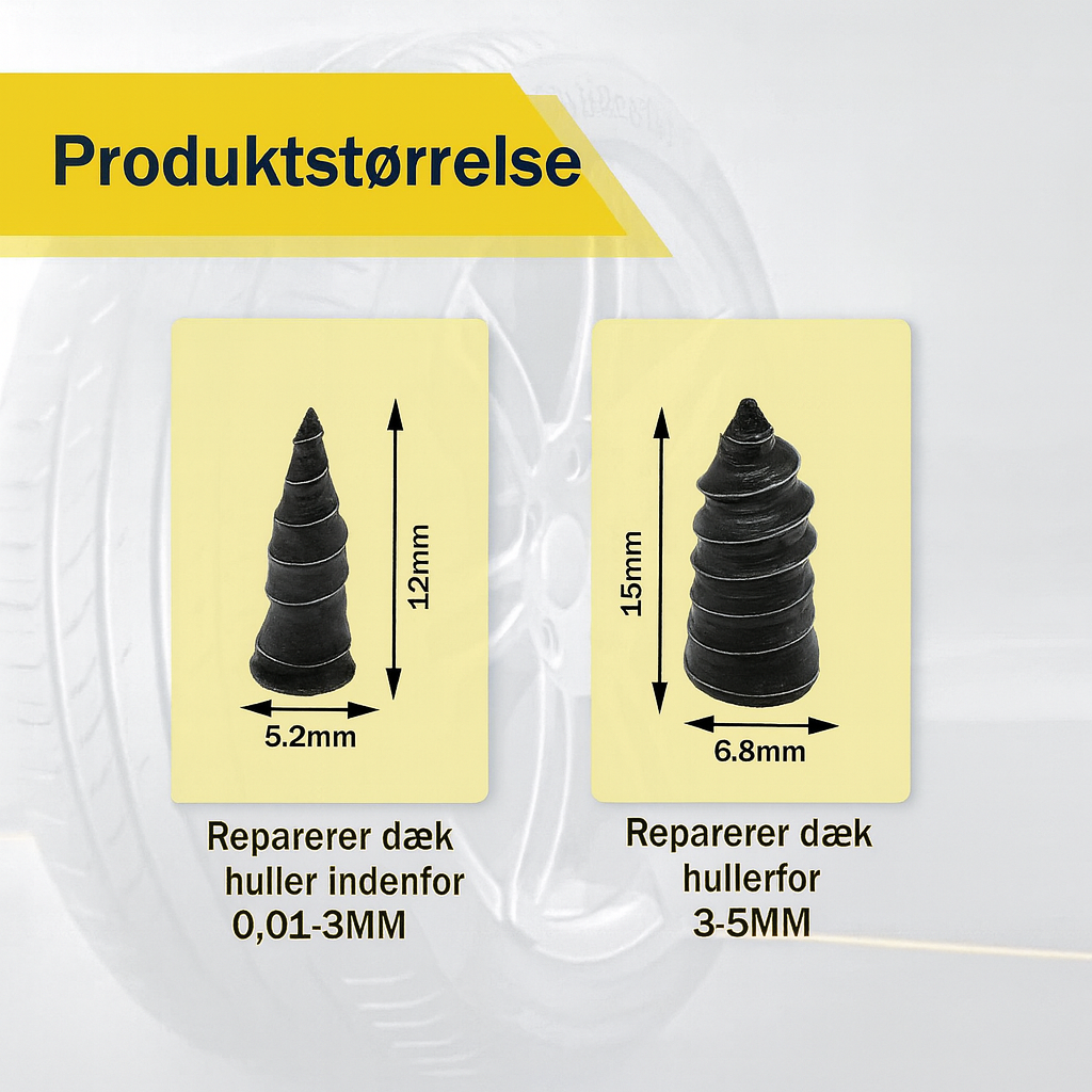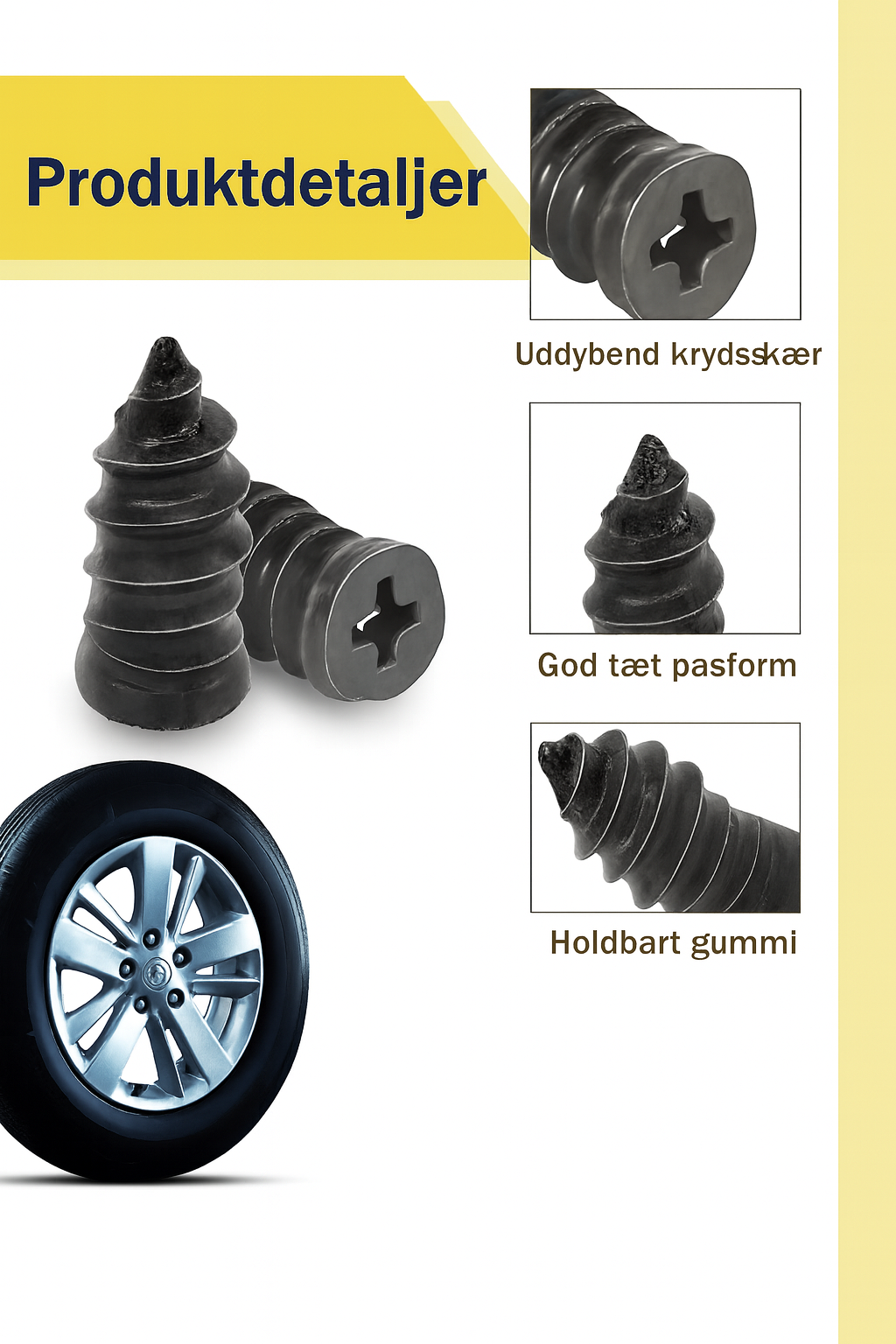 Stå aldrig mere fast med et punkteret dæk. Denne smarte løsning gør det muligt at udføre en nødreparation uden at fjerne dækket og helt uden brug af donkraft. Du skal blot skrue reparationssømmet ind i hullet for en hurtig og sikker tætning. Den perfekte løsning til alle, der vil hurtigt videre på vejen.